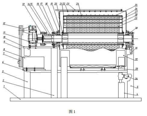 在底座上轴承座支架Ⅰ与轴承座支架Ⅱ之间安装两个外筒体支架,在两个外筒体支架的上方安装外筒体。外筒体为圆形筒体,分为上外筒体和下外筒体,上外筒体和下外筒体通过外筒凸缘连接,在上外筒体的上方设有一排喷嘴,在喷嘴的上方设有一根喷淋管,喷淋管与喷嘴之间通过圆管相连。在上外筒体上开有外筒进料口,在外筒进料口上安装外筒门。在下外筒体下方设有下料口,在下料口上安装外筒下门 ;在下外筒体下方还设有排水口。外筒体的两端为外筒体端板,在其中一个外筒体端板的上方设有检视口,在该外筒体端板的下方设有溢流口和液位计。两个外筒体端板分别开有中心孔,轴承座Ⅰ和轴承座Ⅱ分别安装在两个外筒体端板的中心孔中,其中轴承座Ⅰ的下方通过螺栓安装在减速机底座上,轴承座Ⅱ的下方通过螺栓安装在轴承座支架Ⅱ的上端。在外筒体内腔有一根主轴,该主轴的一端安装在轴承座Ⅱ内,主轴的另一端穿过轴承座Ⅰ通过联轴器与减速机输出轴连接。在外筒体内的主轴上安装两个法兰盘,法兰盘与主轴通过键连接 ;内筒安装在外筒体内,内筒为鼠笼型结构,内筒的两端为内筒端板,该内筒端板通过螺栓固定在法兰盘上,在内筒两个内筒端板之间均匀安装数个支撑杆,形成了内筒的鼠笼型骨架,在内筒两个内筒端板之间还设有一个内筒门框架,在该内筒门框架上安装一个内筒门 ;在支撑杆外侧包裹一层滤布,滤布外侧包裹钢丝网,其中内筒门不包裹滤布和钢丝网。